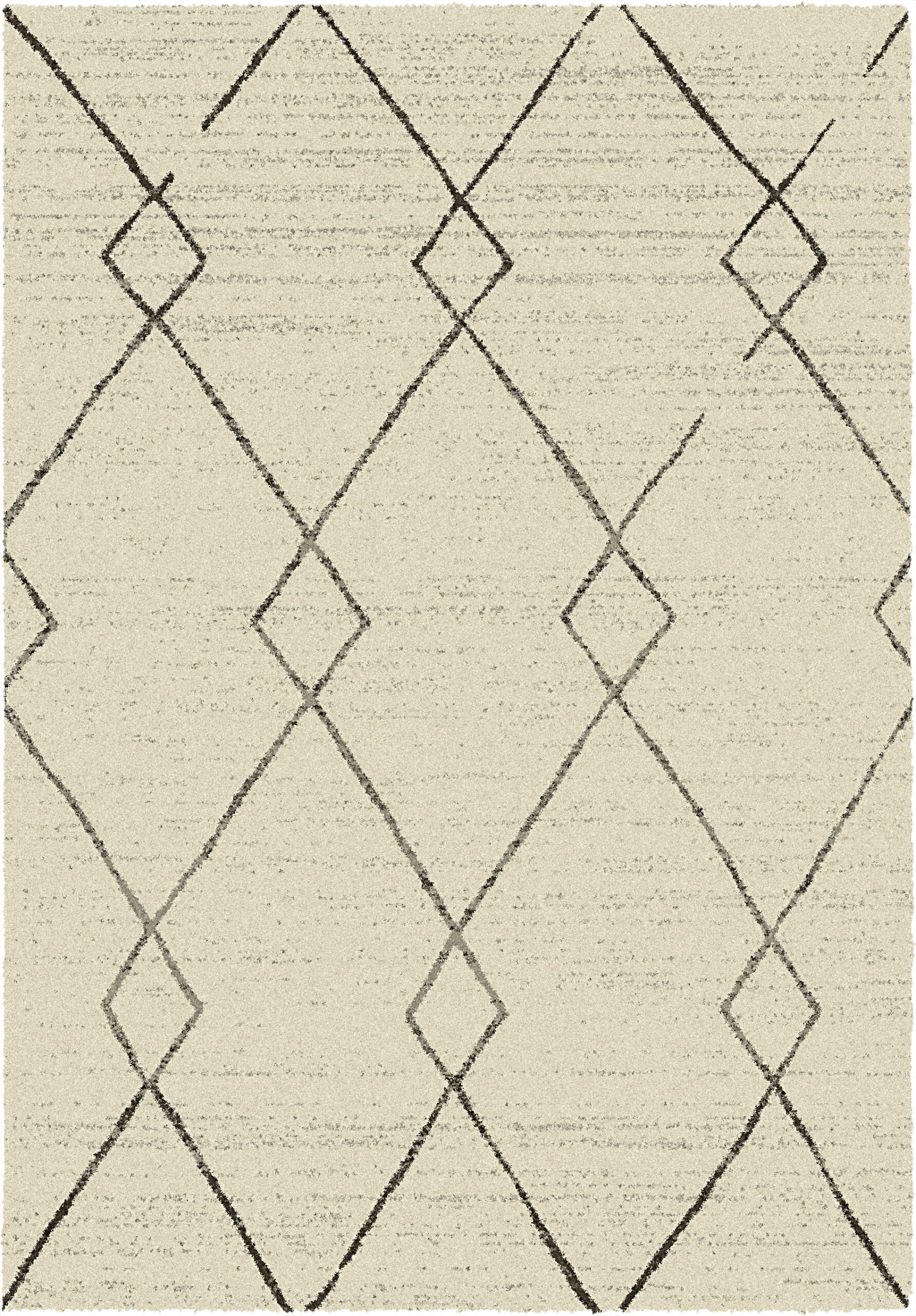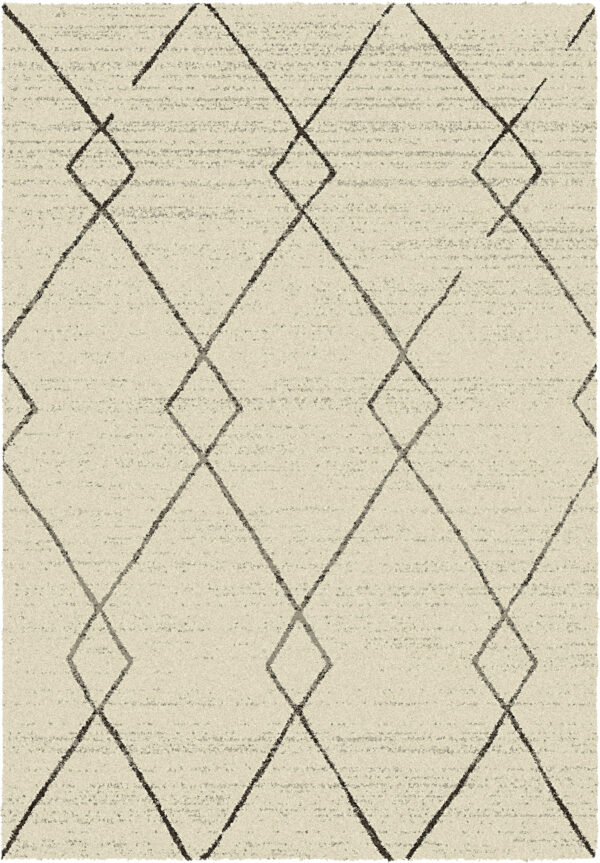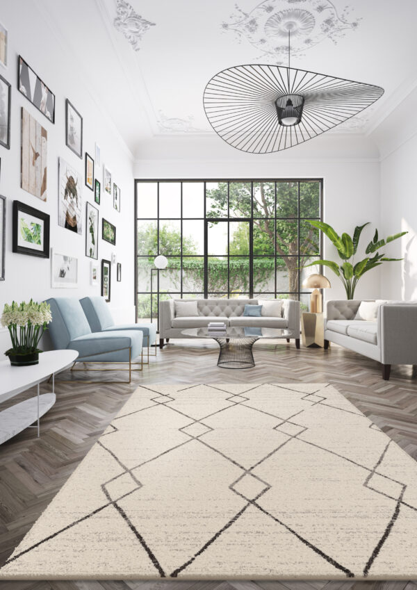 שטיח מקולקציית קניון בדוגמה אתנית גאומטרית מרוקאית בצבעי בז’ שחור.