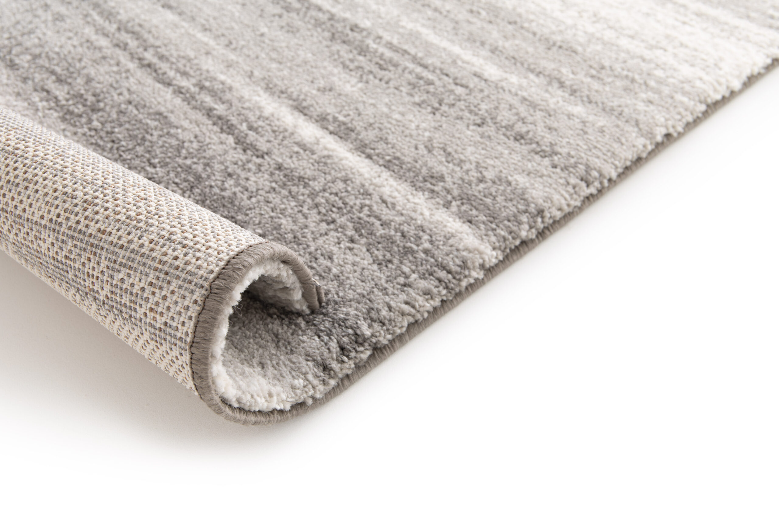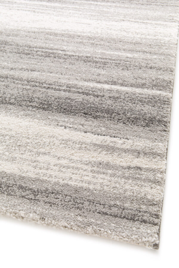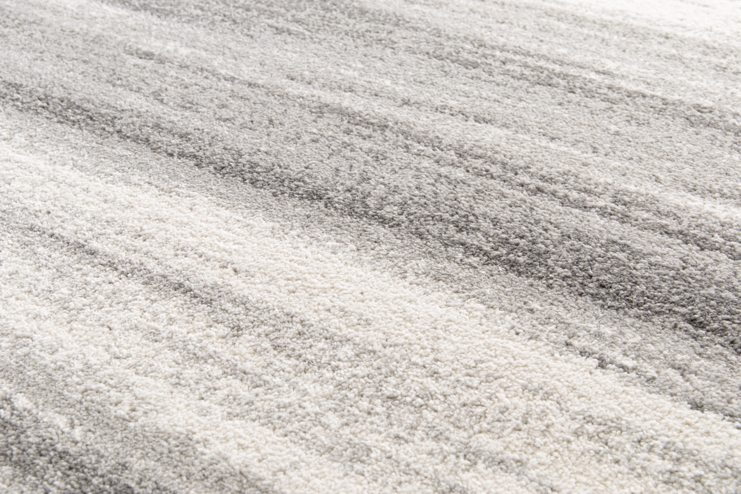 שטיח מודרני בסגנון אבסטרקטי בשילוב צבעי אפור כהה ואפור בהיר עם מריחות לבנות.