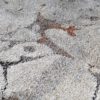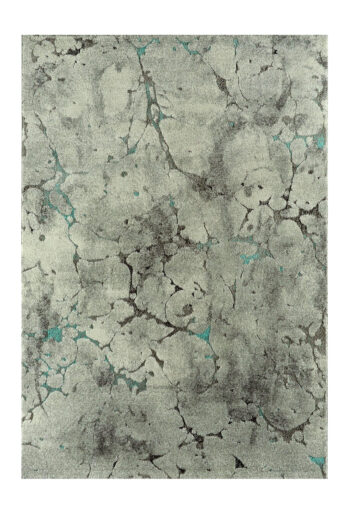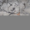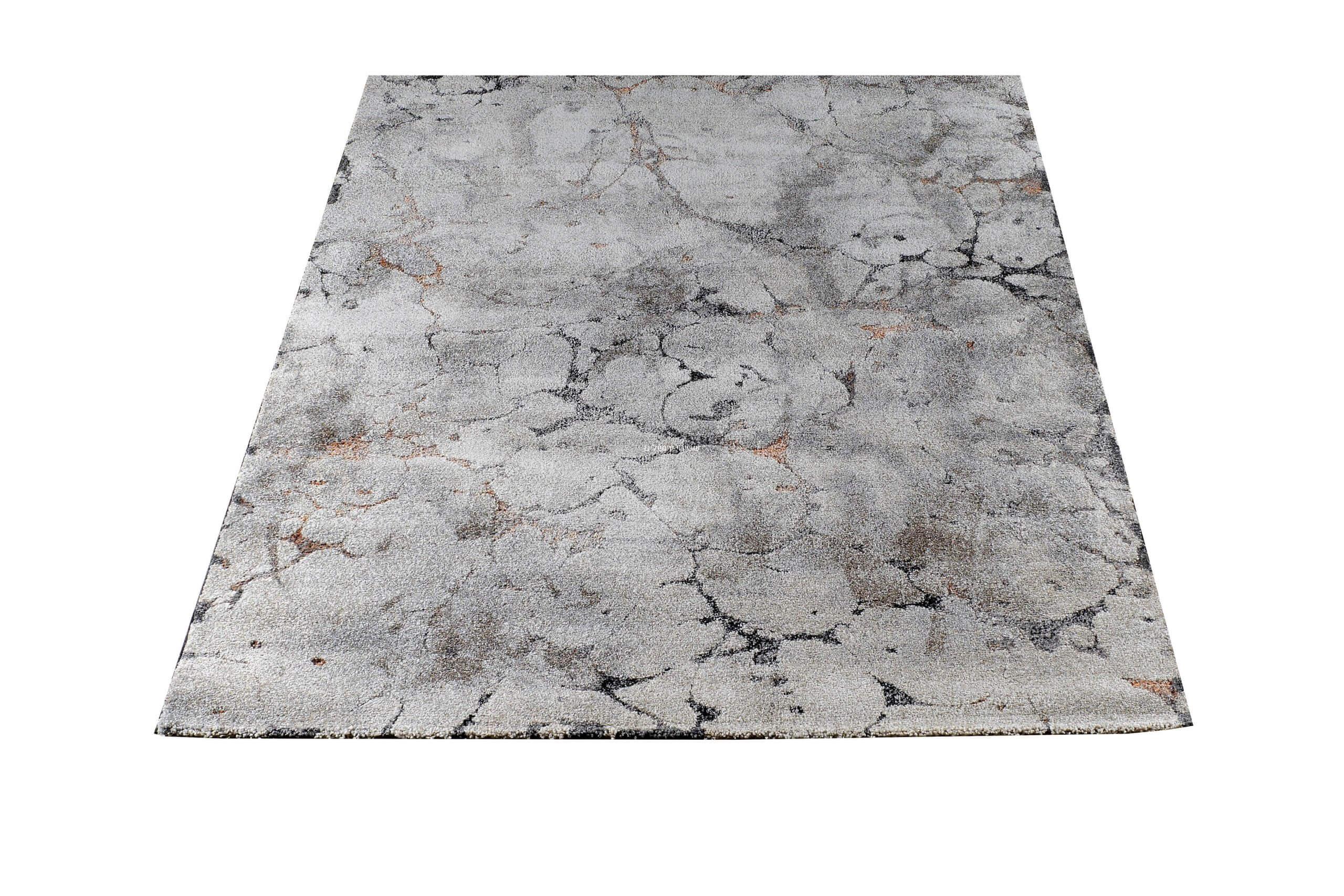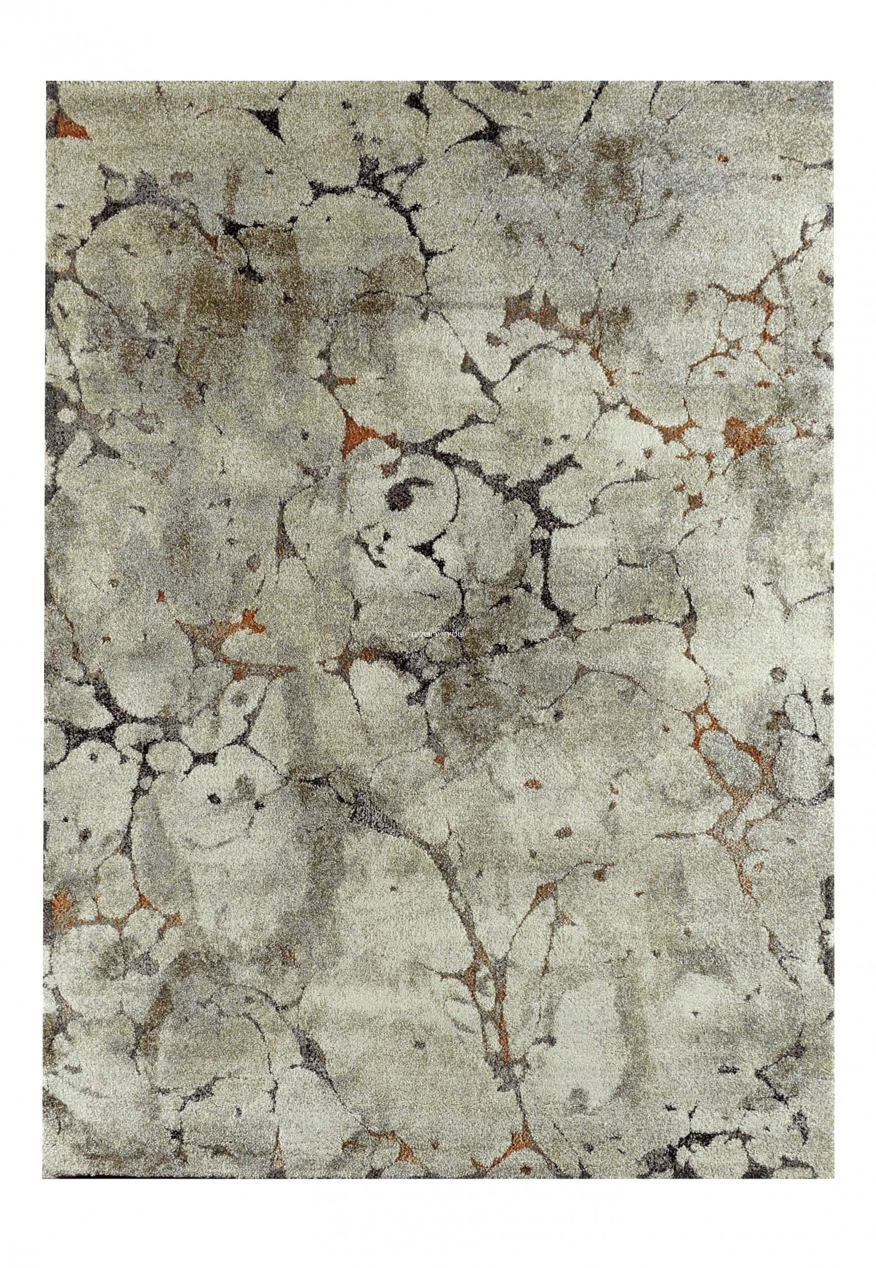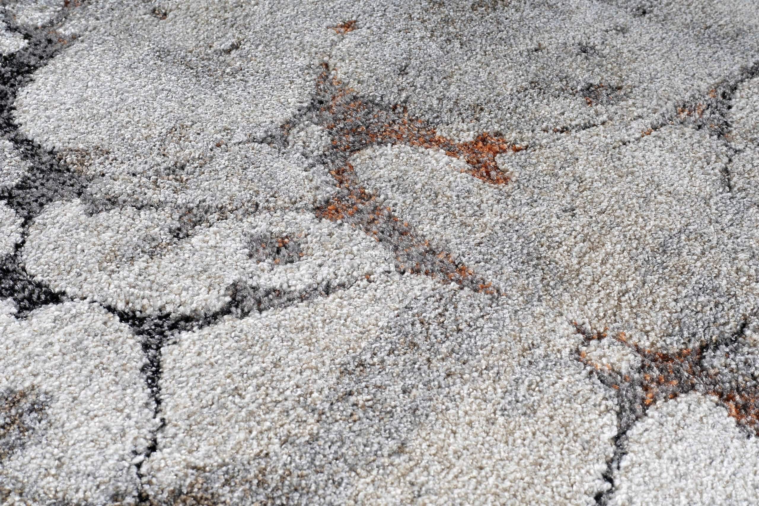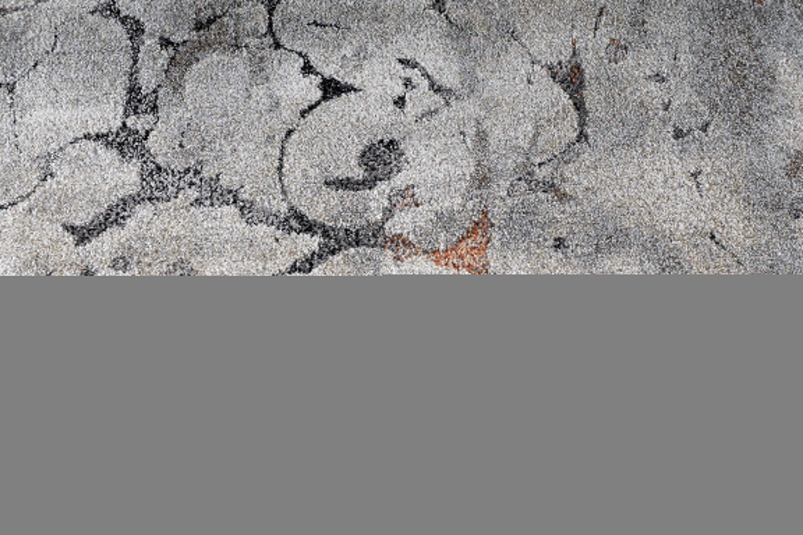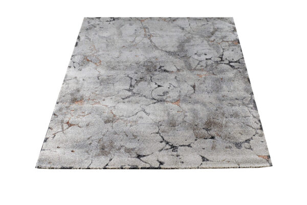 שטיח מודרני אבסטרקטי בדוגמת שברי בטון עם נגיעות עדינות של צבעי אפור כהה, כתום ושחור.