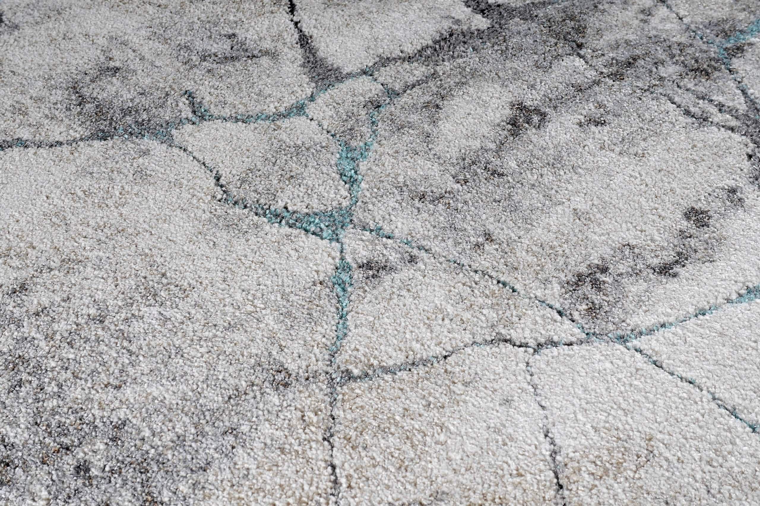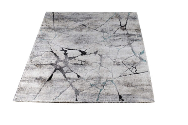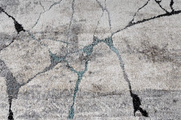 שטיח מודרני אבסטרקטי בדוגמת שברי בטון עם נגיעות עדינות של צבע תכלת ושחור.