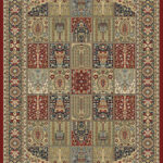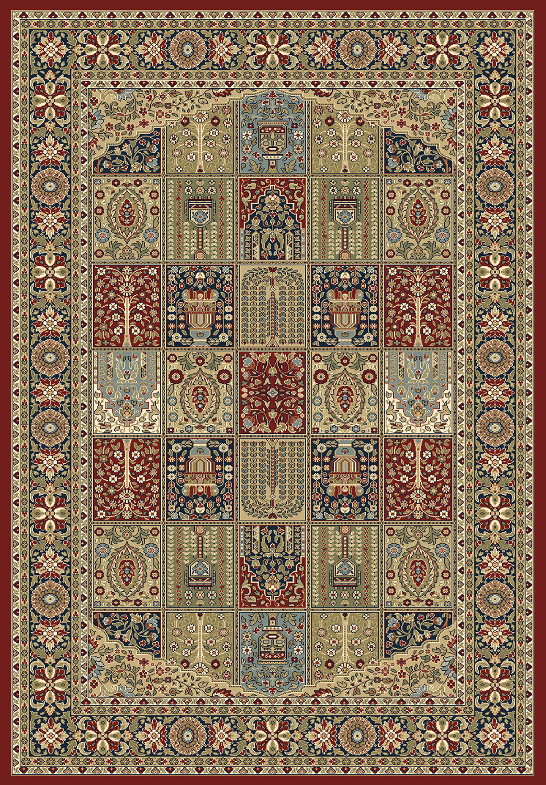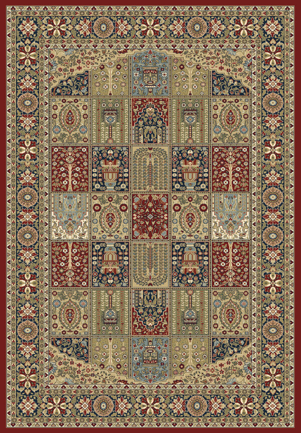 שטיח קלאסי בדוגמת פרחים עם רקע בהיר ומסגרת בצבע אדום.